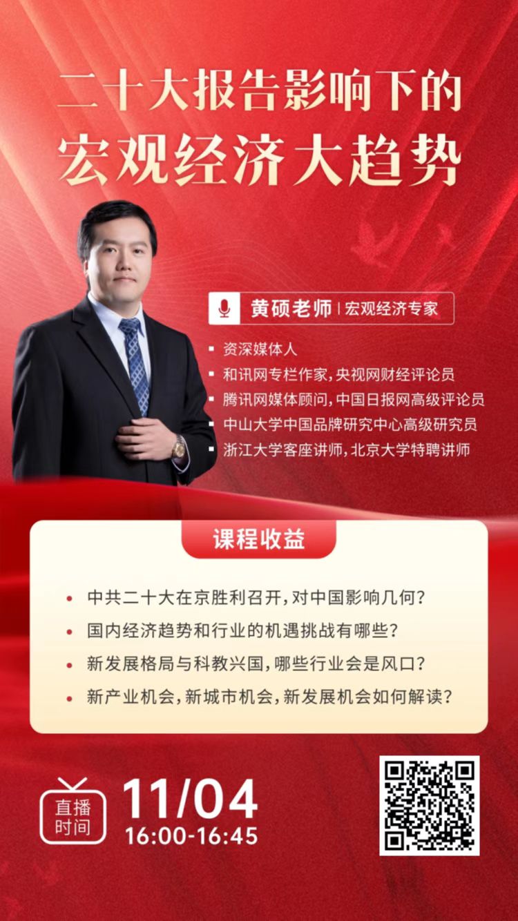中共二十大在京胜利召开,对中国影响几何?国内经济趋势和行业的机遇挑战有哪些?新发展格局与科教兴国,哪些行业会是风口?新产业机会,新城市机会,新发展机会如何解读?11月4号16:00,黄硕老师《二十大报告影响下的宏观经济大趋势》直播