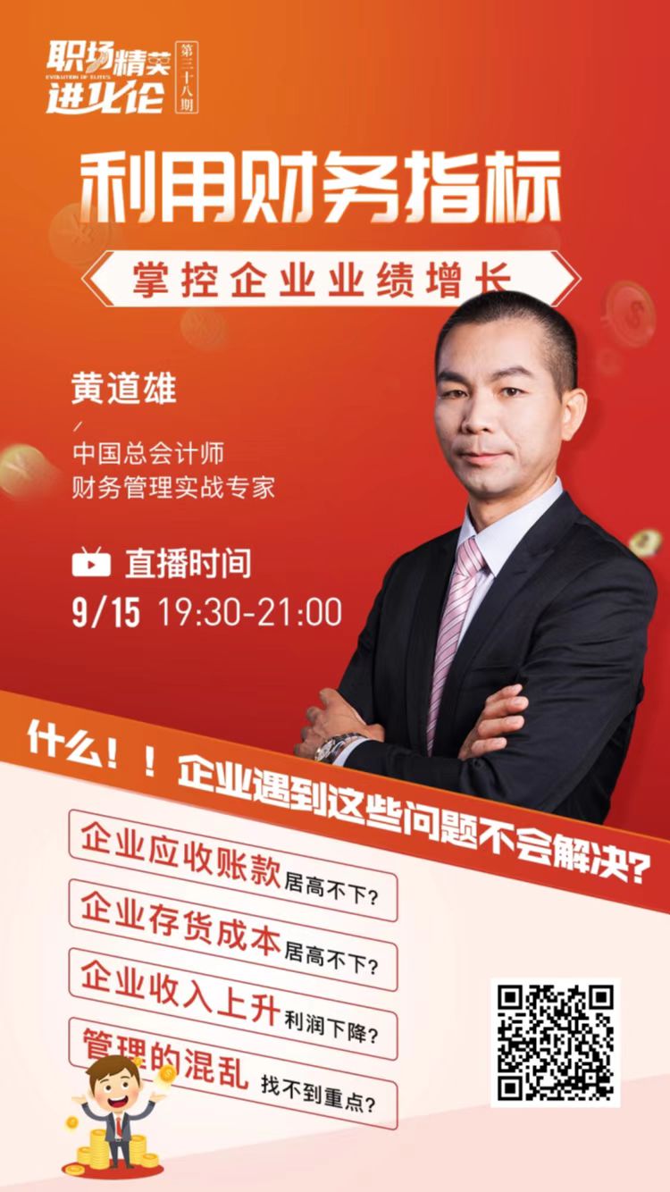 控制企业经营风险,推动企业盈利增长,你,财务经营管理思维,系统吗?9月15日19:30-21:00【职场精英进化论直播间】,黄道雄老师诚意分享《利用财务指标掌控企业业绩增长》,干货十足,准时相约。